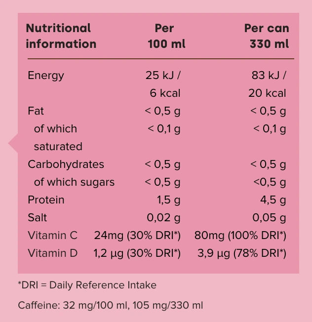 Warning: high caffeine content (32 mg/100 ml; 105 mg/330 ml). Maximum 2 cans per day. Not recommended for children, pregnant/nursing women, or caffeine-sensitive individuals. Recommended from 18 years of age.