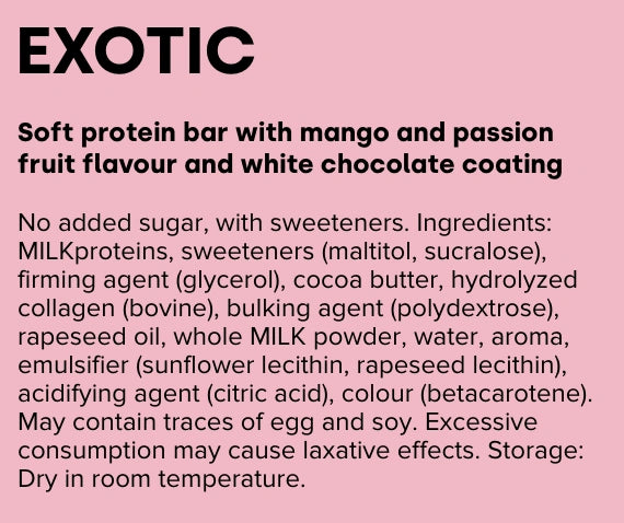 LOHILO protein bar with mango and passion fruit flavor, coated with white chocolate (17%). No added sugar, with sweeteners. Ingredients: MILK proteins, sweeteners (maltitol, sucralose), humectant (glycerol), cocoa butter, hydrolyzed collagen (from beef), filler (polydextrose), rapeseed oil, whole milk powder (MILK), water, flavor, emulsifiers (sunflower lecithin, rapeseed lecithin), acidity regulator (citric acid), coloring (beta-carotene). May contain traces of EGG and SOYA. Excessive consumption may cause laxative effects. Storage: keep in a dry place at room temperature.