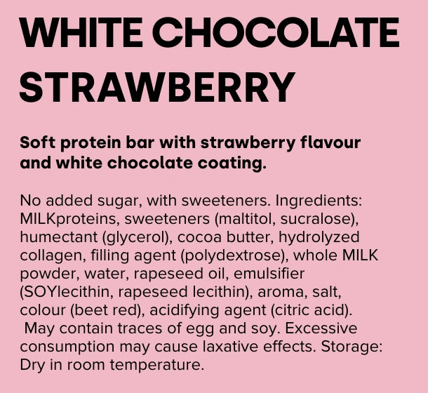 LOHILO protein bar strawberry flavored, coated with white chocolate (17%). Without added sugar, with sweeteners. Ingredients: MILK proteins, sweeteners (maltitol, sucralose), humectant (glycerol), cocoa butter, hydrolyzed collagen, filler (polydextrose), whole milk powder (MILK), water, rapeseed oil, emulsifier (SOYA lecithin, rapeseed lecithin), flavor, salt, coloring (beet red), acidity regulator (citric acid). May contain traces of EGG and SOYA. Excessive consumption may cause laxative effects. Storage: keep in a dry room temperature.