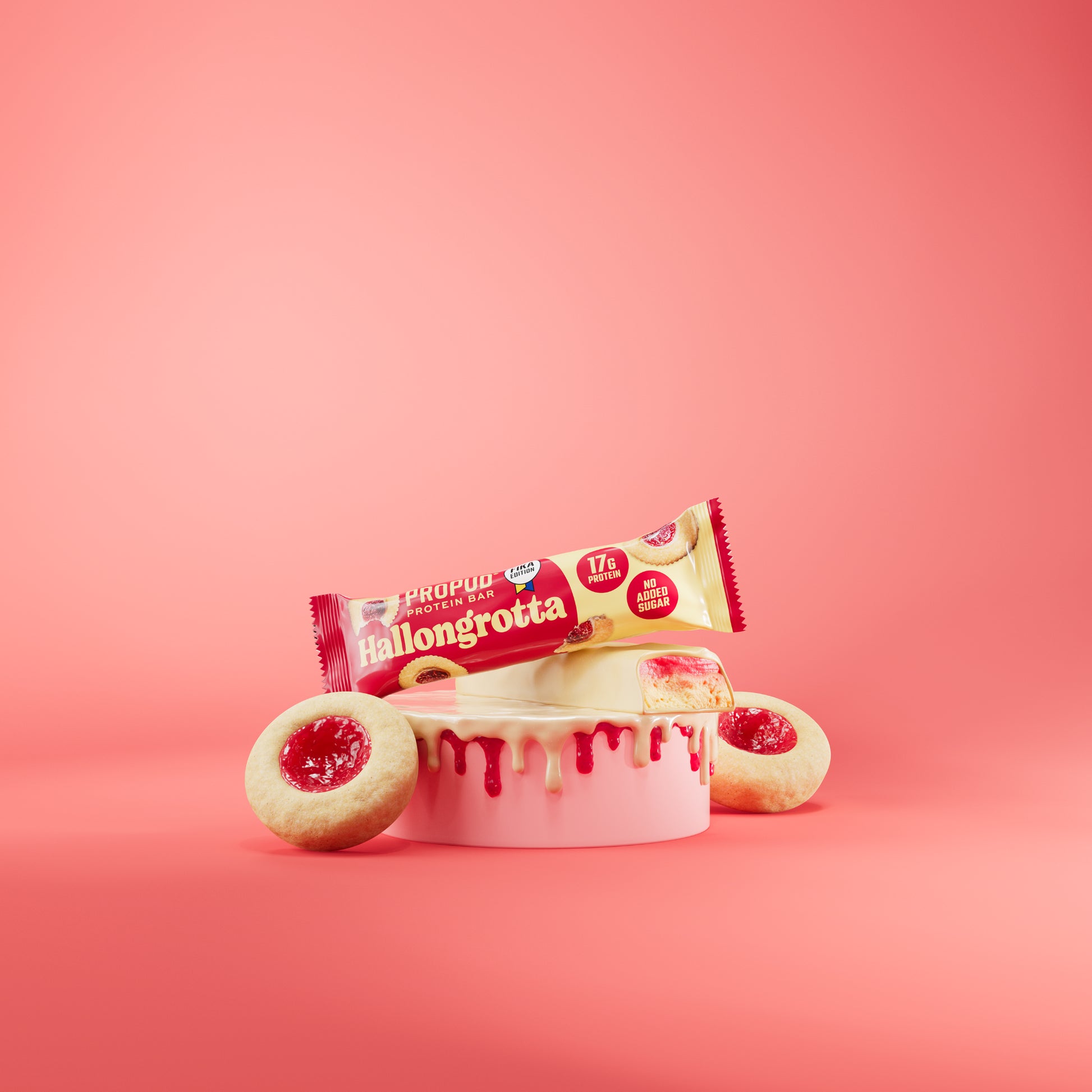 ProPud proteiinibatoon "hallongrotta" (magusainega) koostisained: PIIMAVALGUD, magusaine: maltitool, želatiin (veise), niiskusesäilitaja: glütserool, kakaovõi, polüdekstroosisiirup (täiteaine: polüdekstroos, vesi), lõssipulber, küpsisepurugraanulid (6,9%) (magusained: maltitool, isomalt, erütritool; maisijahu, kartulitärklis, VÕI, riisijahu, modifitseeritud tärklis, tapiokitärklis, sool, looduslik lõhna- ja maitseaine, kergitusaine: naatriumkarbonaadid), oligofruktoosisiirup (oligofruktoos, vesi), MANDELvalk, veevaba PIIMARASV, hape: sidrunhape, lõhna- ja maitseained (PIIM), sool, värvitoit: kontsentreeritud peedimahl, emulgaator: letsitiinid (SOJA), värvitoit: porgandimahla kontsentraat, magusained: aspartaam, atsesulfaam K. Sisaldab fenüülalaniini allikat.